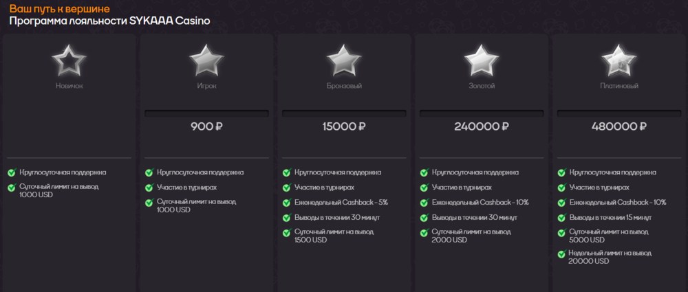 В виртуальном клубе для активных игроков действует выгодная программа лояльности. Она состоит из шести статусов: